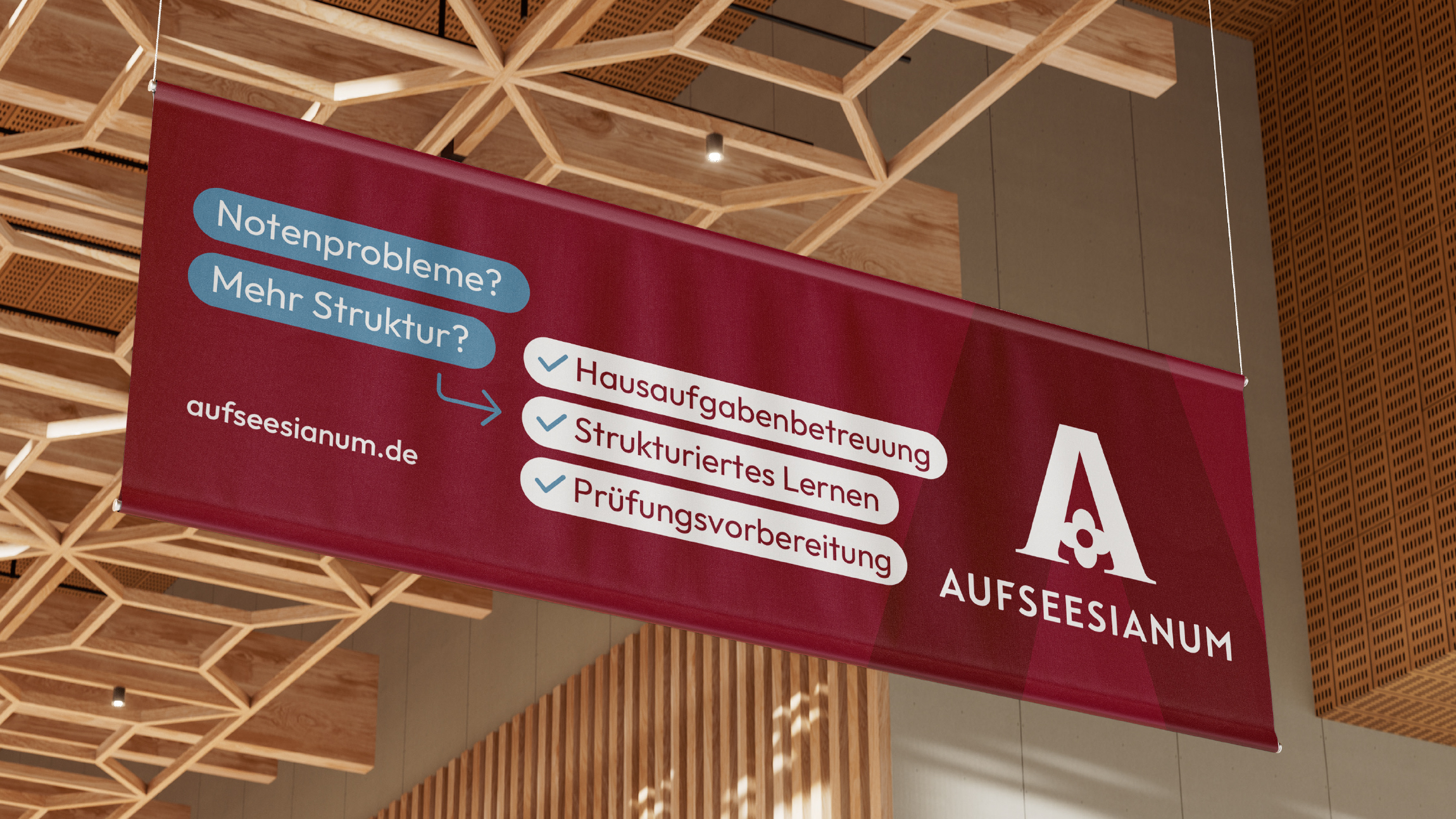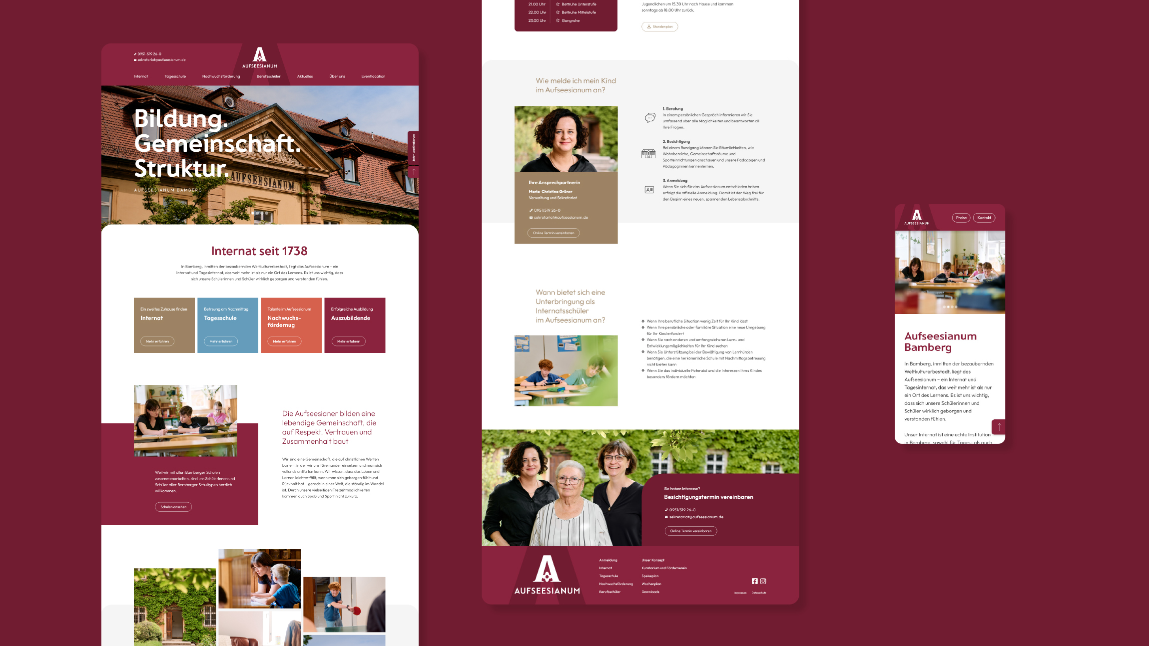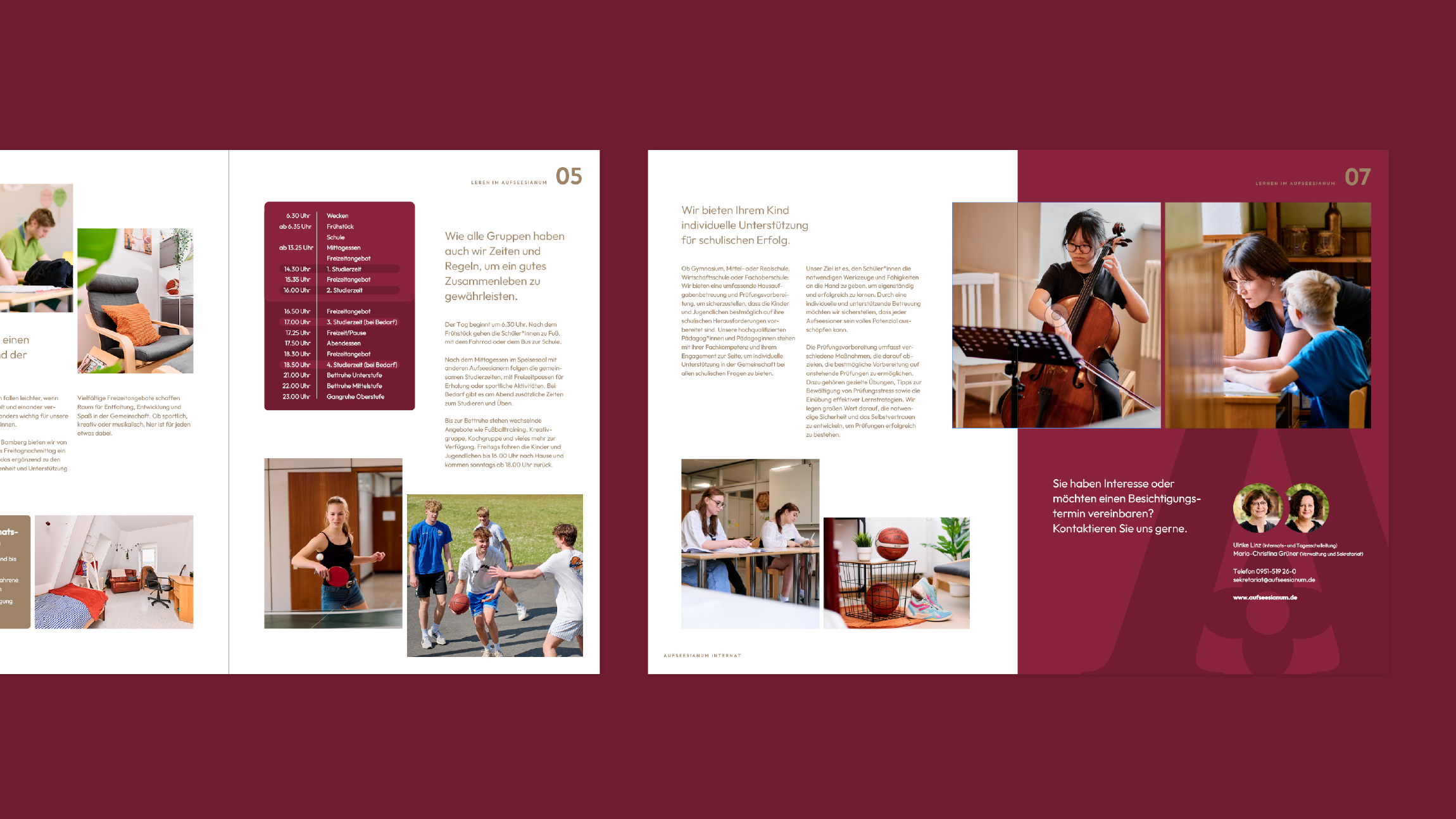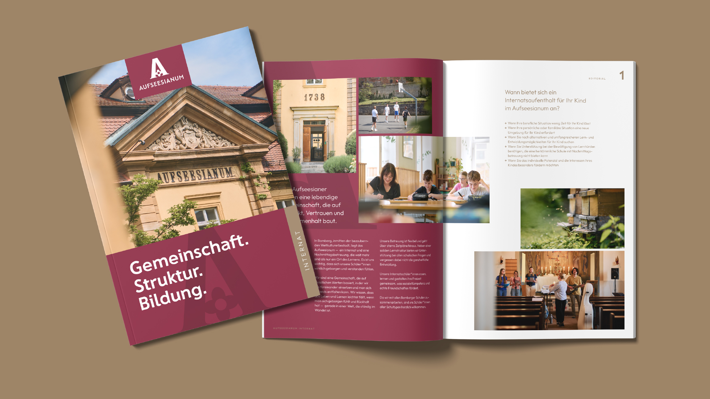 Das Aufseesianum, ein Internat mit Tagesschülern im historischen Zentrum Bambergs. Komplett-Relaunch von Logo, Farbwelten, Schriftsystem, Broschüren, Fotos und Website zur Modernisierung und Stärkung der visuellen Identität.