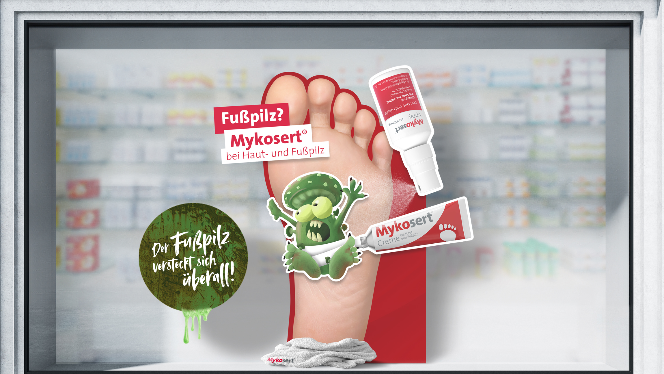 Für Mykosert entwickelten wir ein ansprechendes Corporate Design und übertrugen dieses auf sämtliche PoS-Materialien. Das sympathische Maskottchen „Eddie“ setzt das medizinische Spray gegen Haut- und Fußpilz perfekt in Szene und verleiht dem Markenauftritt Aufmerksamkeit.