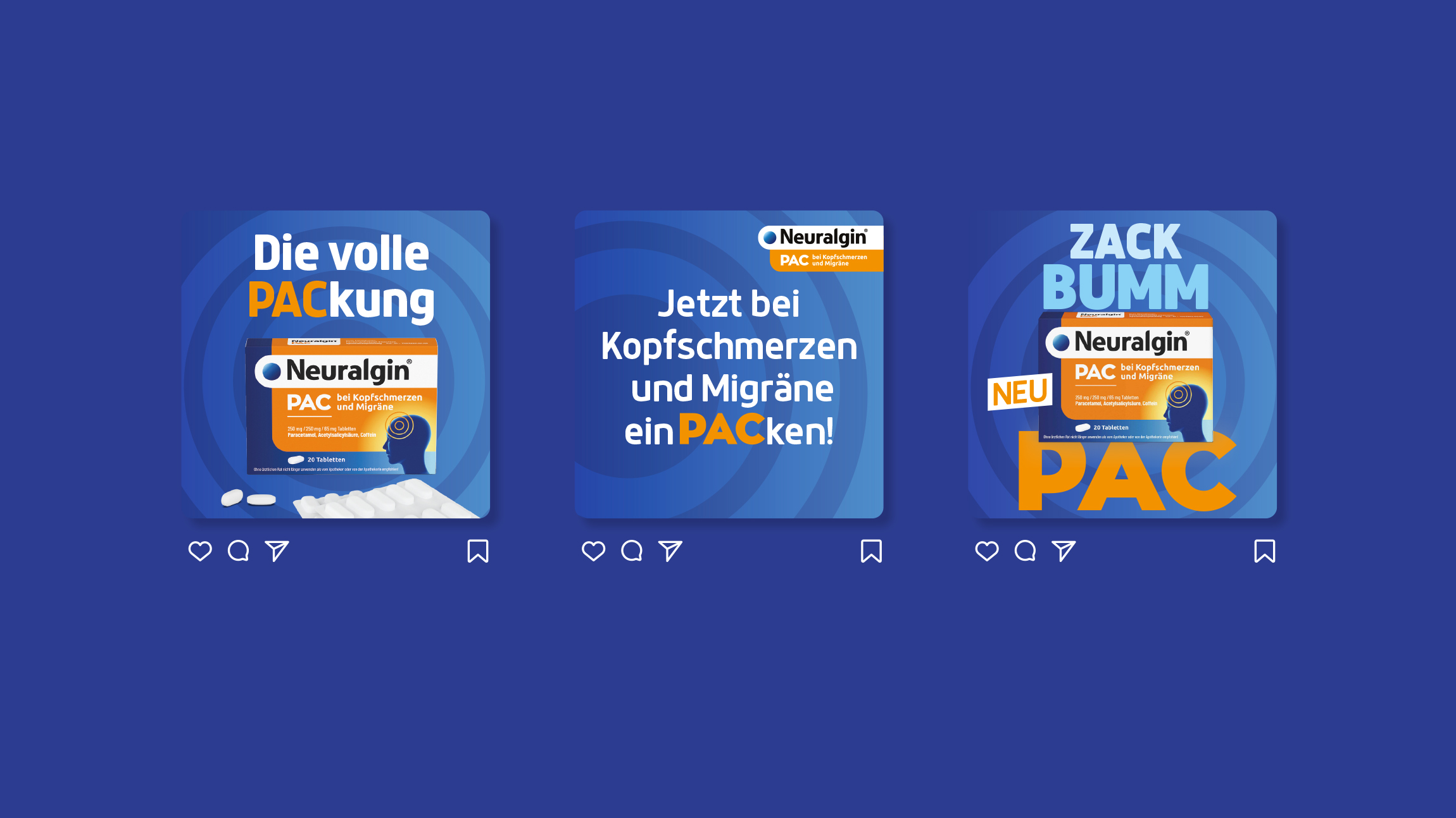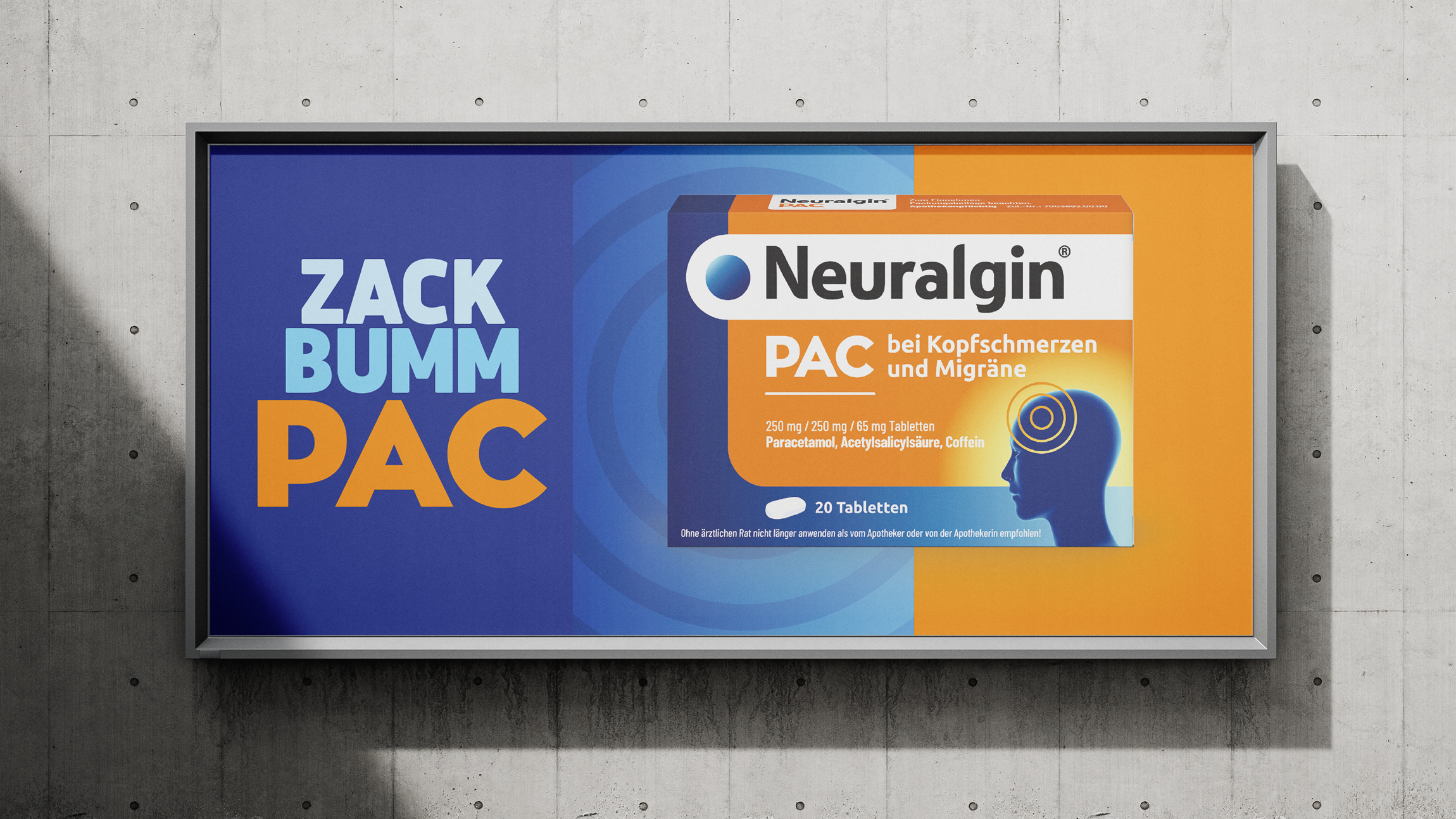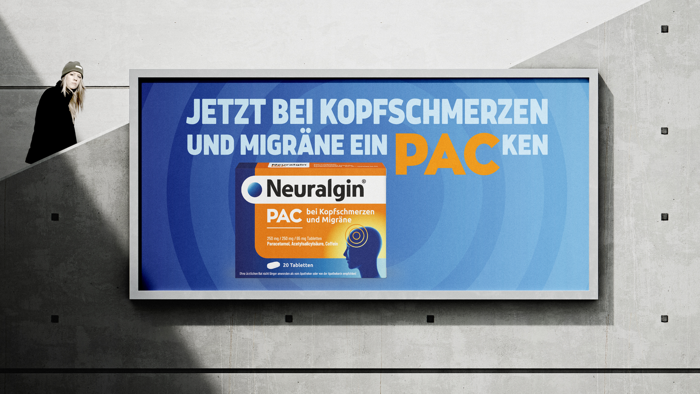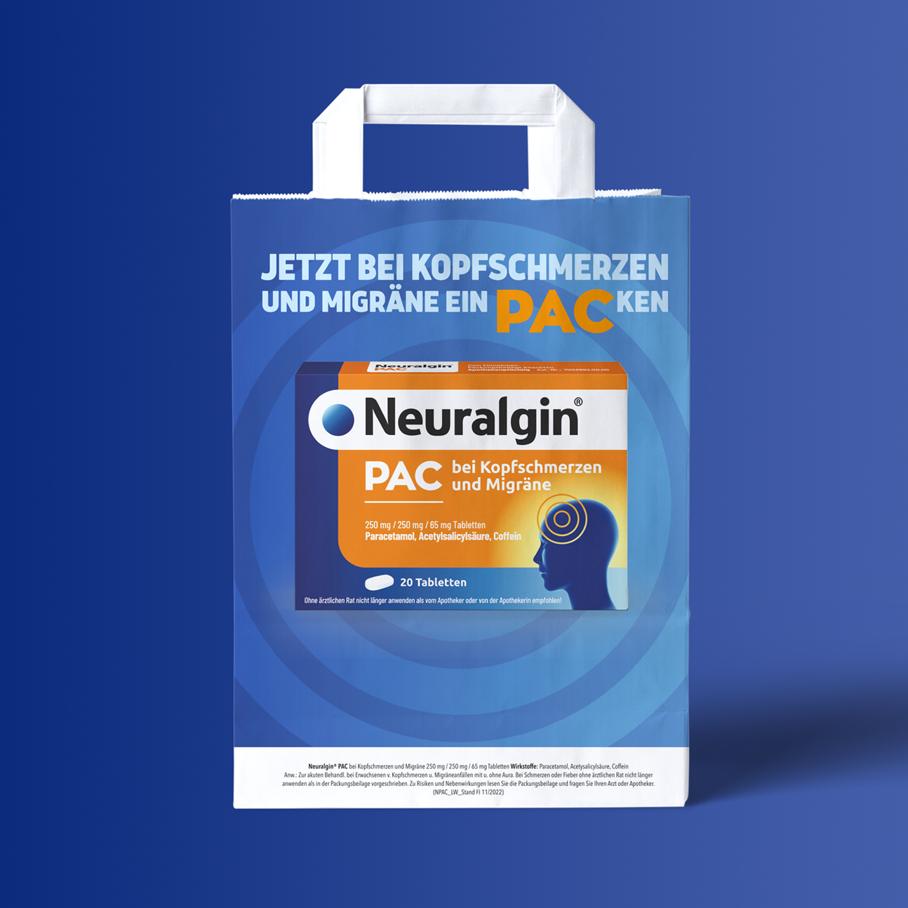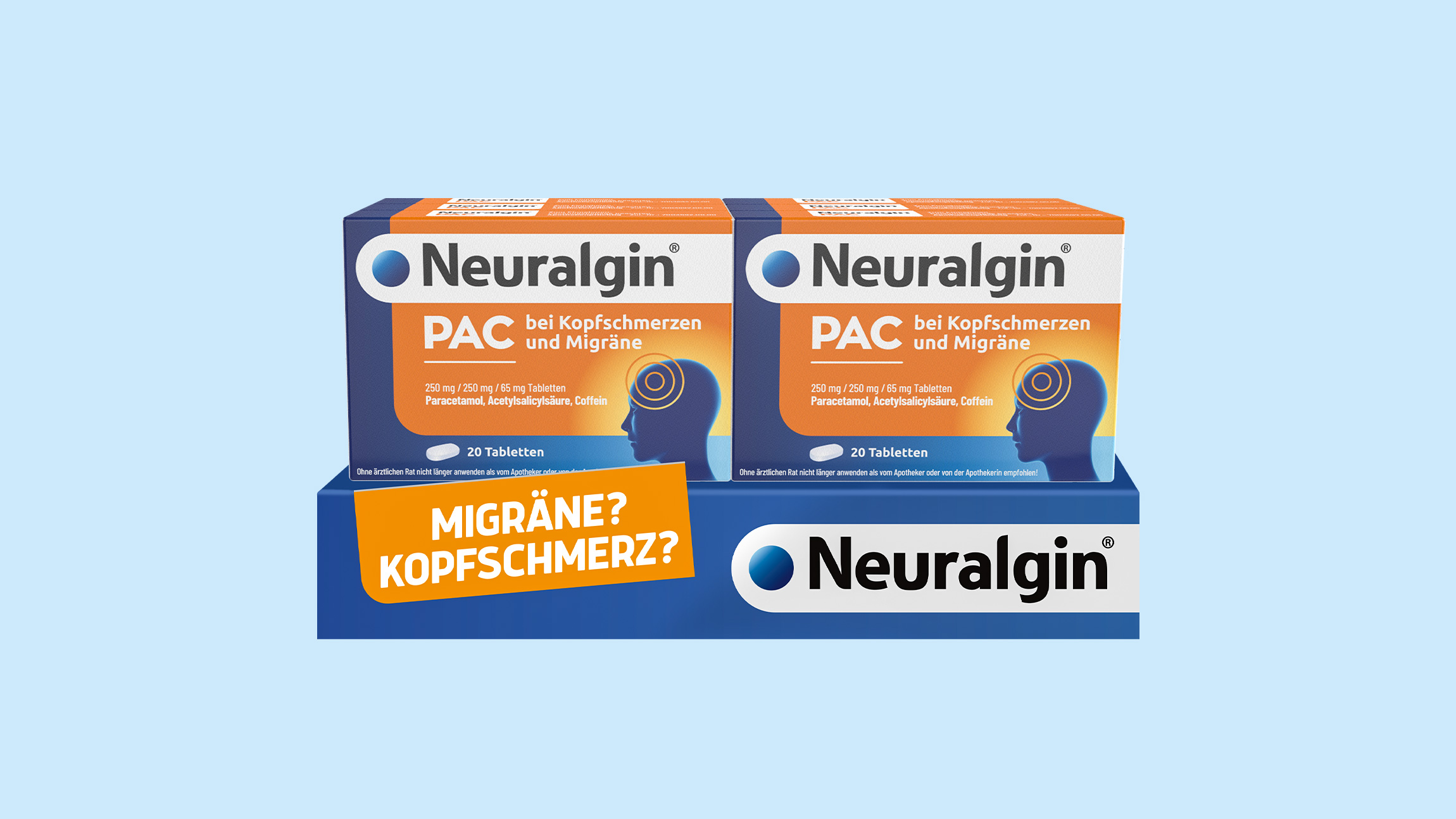 Pflichangaben: Neuralgin® PAC bei Kopfschmerzen und Migräne 250 mg / 250 mg / 65 mg Tabletten, Wirkstoffe: Paracetamol, Acetysalicylsäure, Coffein, Anw.: Zur akuten Behandl. bei Erwachsenen v. Kopfschmerzen u. Migräneanfällen mit u. ohne Aura., Ohne ärztlichen Rat nicht länger anwenden als vom Apotheker oder von der Apothekerin empfohlen! Zu Risiken und Nebenwirkungen lesen Sie die Packungsbeilage und fragen Sie Ihre Ärztin, Ihren Arzt oder in Ihrer Apotheke.