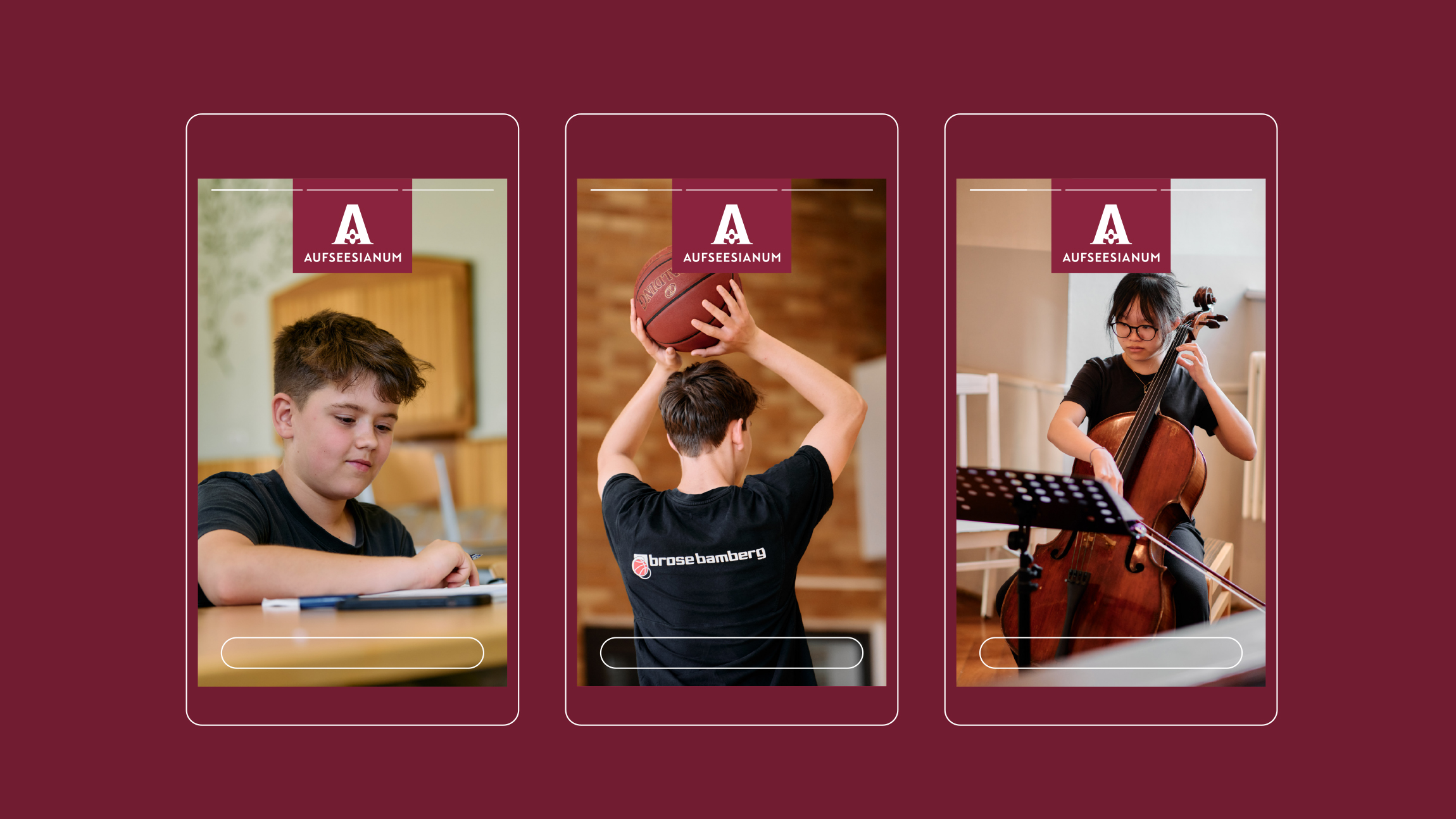 Das Aufseesianum, ein Internat mit Tagesschülern im historischen Zentrum Bambergs. Komplett-Relaunch von Logo, Farbwelten, Schriftsystem, Broschüren, Fotos und Website zur Modernisierung und Stärkung der visuellen Identität.