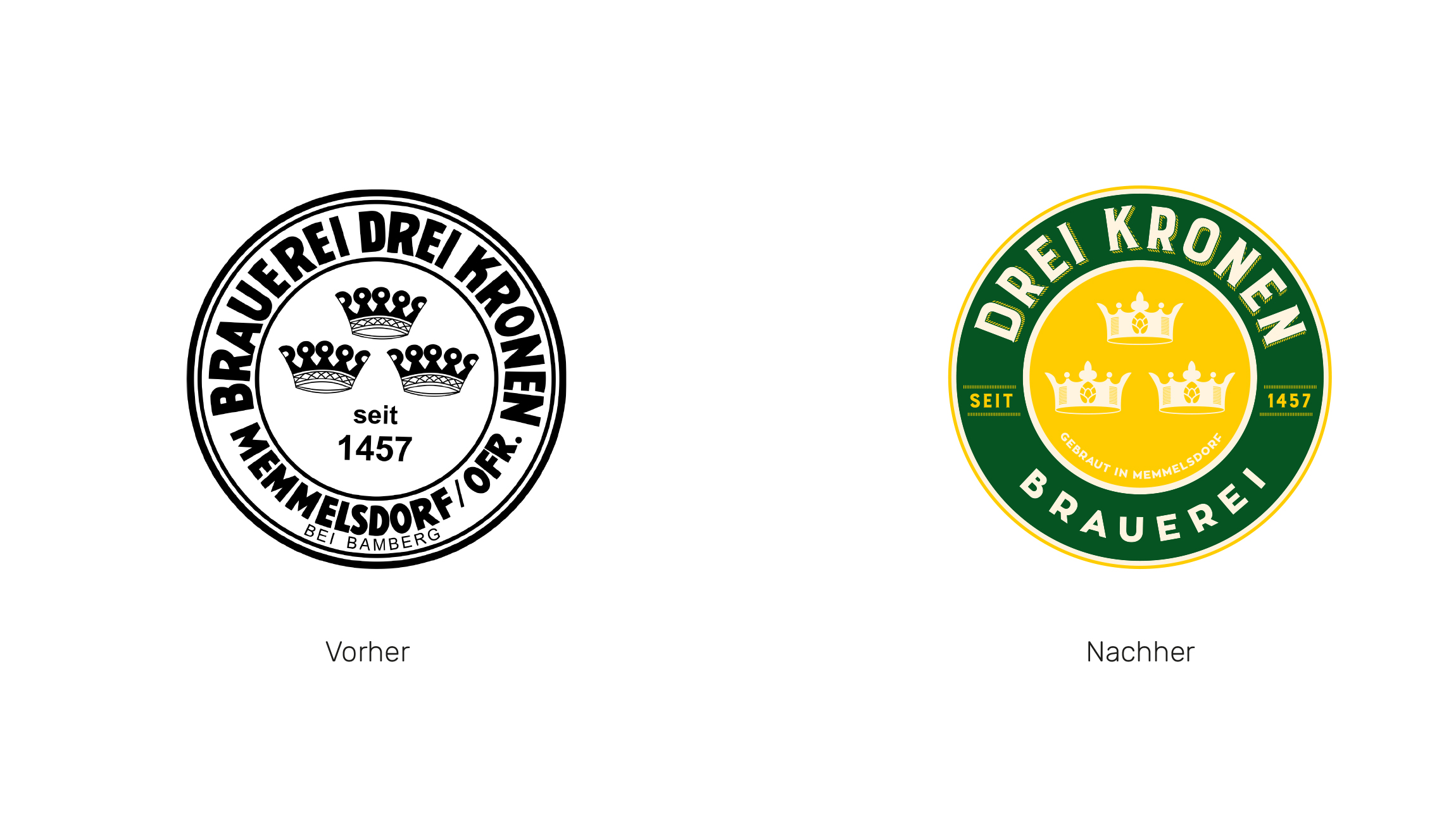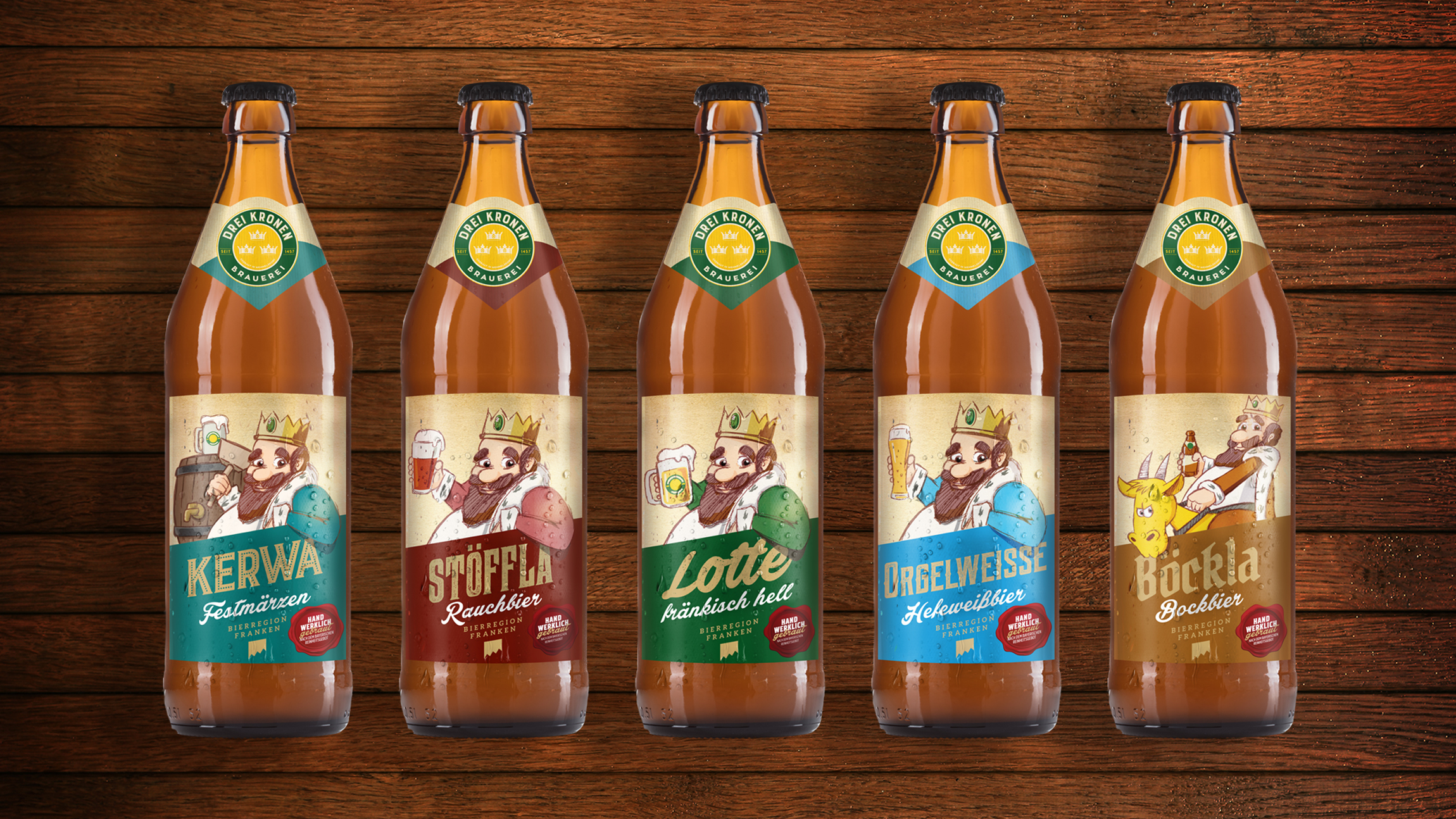 Für die Brauerei Drei Kronen Memmelsdorf entwickelten wir Logo, Illustrationen, Etiketten, Bierkasten und Kampagne. Das Resultat ist eine authentische Serie, die sich wohltuend von herkömmlichem Bierdesign in der Region unterscheidet.
