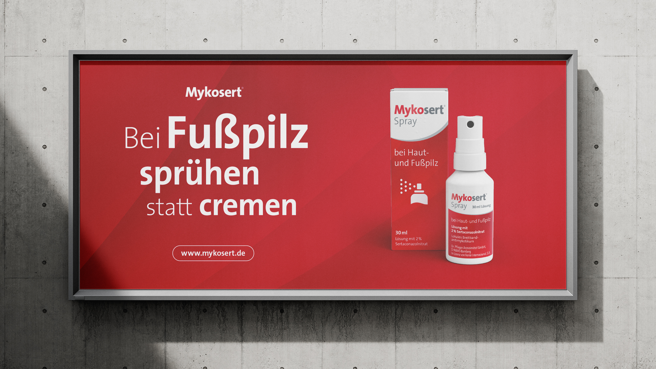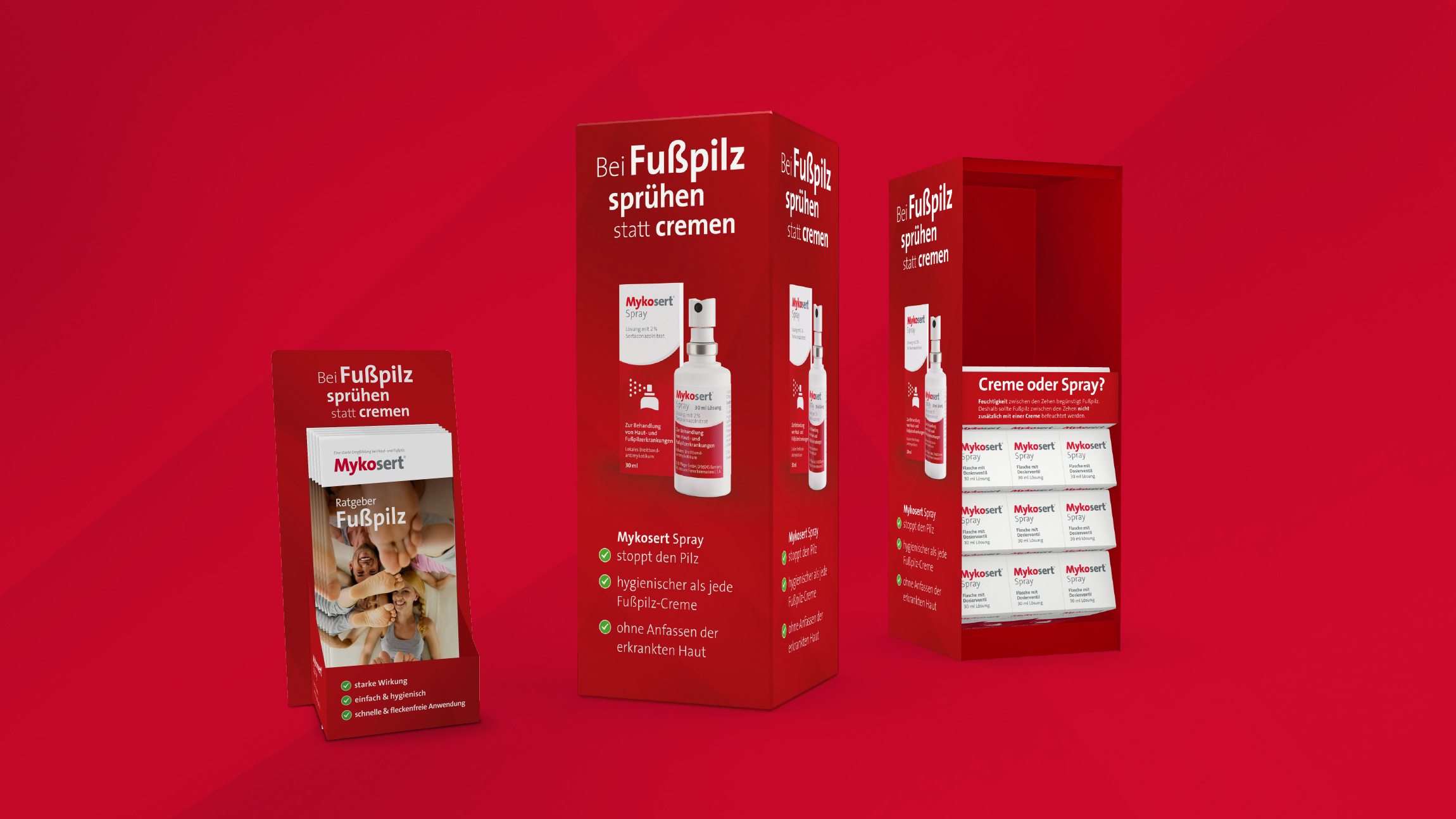 Für Mykosert entwickelten wir ein ansprechendes Corporate Design und übertrugen dieses auf sämtliche PoS-Materialien. Das sympathische Maskottchen „Eddie“ setzt das medizinische Spray gegen Haut- und Fußpilz perfekt in Szene und verleiht dem Markenauftritt Aufmerksamkeit.