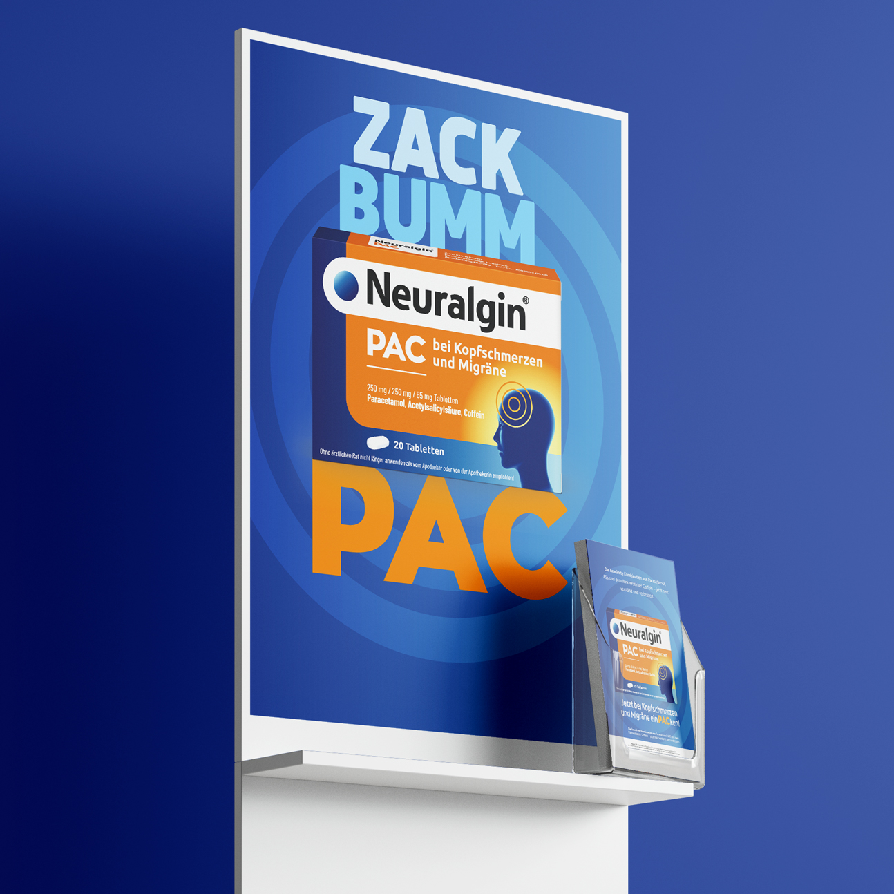 Pflichangaben: Neuralgin® PAC bei Kopfschmerzen und Migräne 250 mg / 250 mg / 65 mg Tabletten, Wirkstoffe: Paracetamol, Acetysalicylsäure, Coffein, Anw.: Zur akuten Behandl. bei Erwachsenen v. Kopfschmerzen u. Migräneanfällen mit u. ohne Aura., Ohne ärztlichen Rat nicht länger anwenden als vom Apotheker oder von der Apothekerin empfohlen! Zu Risiken und Nebenwirkungen lesen Sie die Packungsbeilage und fragen Sie Ihre Ärztin, Ihren Arzt oder in Ihrer Apotheke.