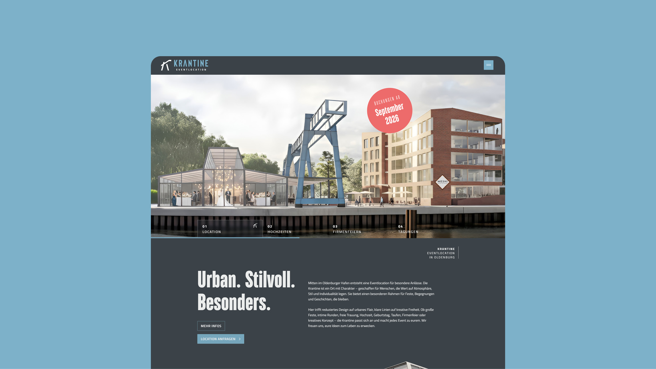 Die neue Eventlocation KRANTINE in Oldenburg – und wir haben den passenden Auftritt geliefert: Logo, Corporate Design und Website aus einem Guss. Klar strukturiert für Hochzeit, Geburtstag, Firmenevent und Tagung – mit kurzem Weg zur Anfrage.