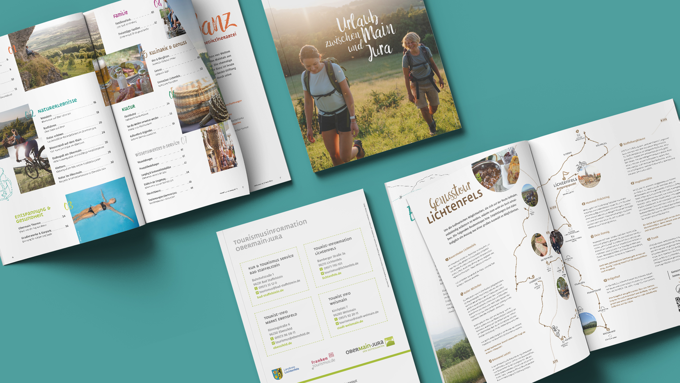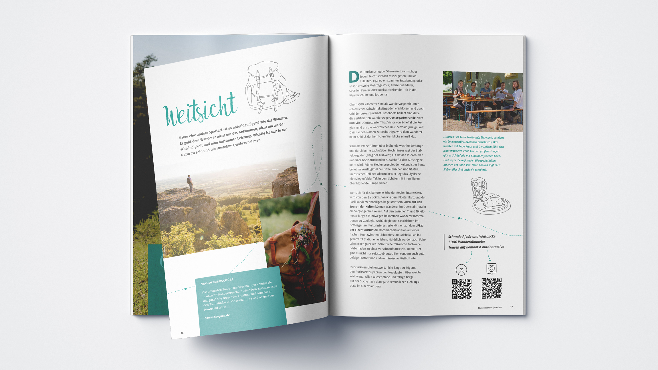 Auf 68 Seiten präsentieren wir den Urlaub zwischen Main und Jura: Von der Planung über das Layout bis hin zu den Illustrationen übernahmen wir die komplette Umsetzung des Imagekataloges, der die informativen Inhalte emotional wiedergibt und Lust auf Urlaub macht.